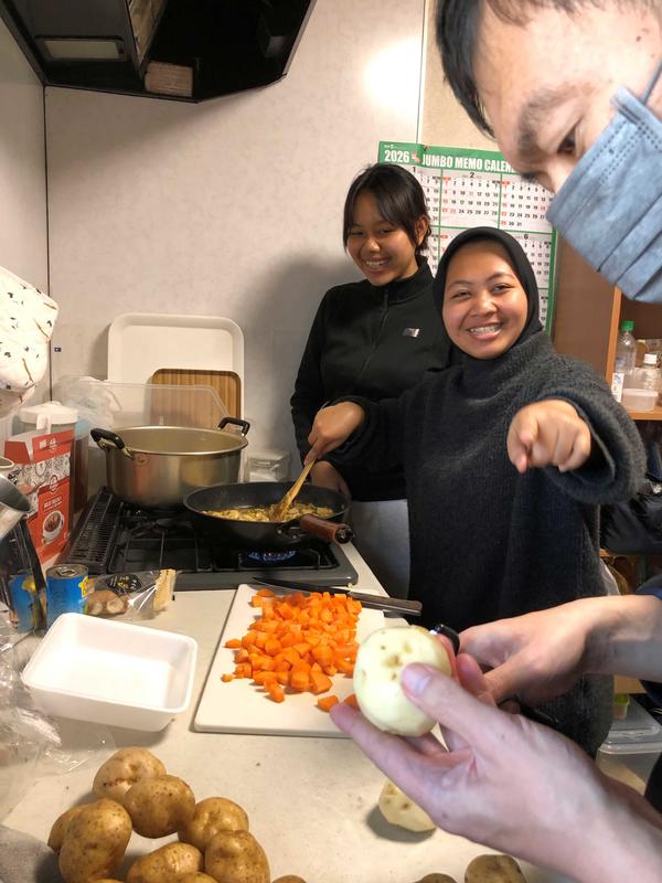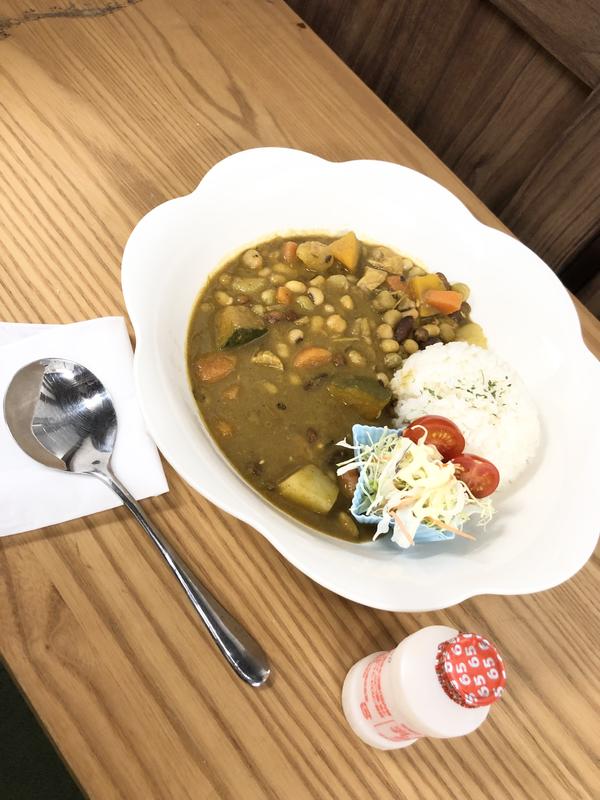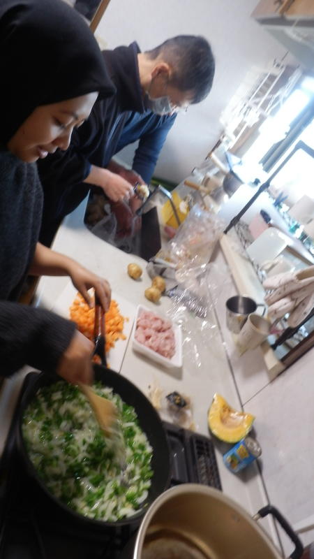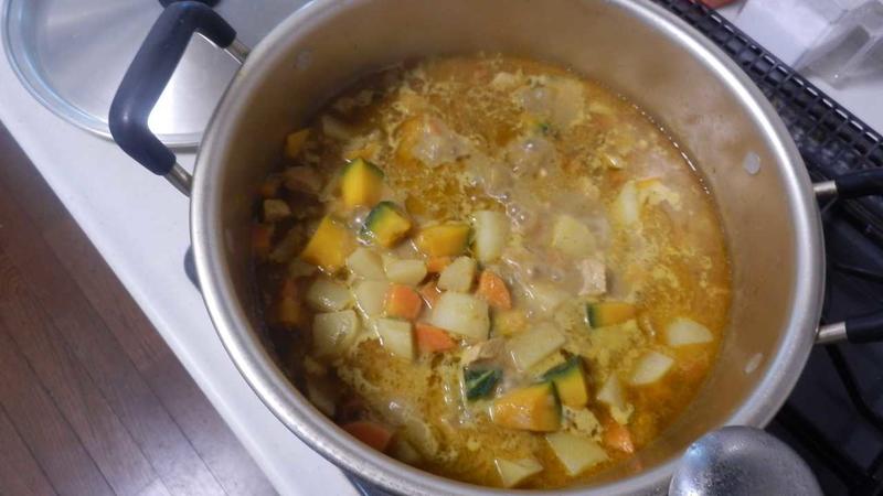 我が事業所のカレーは市販のカレールーを使わず、本場カレー粉と香辛料を使い、にんじん、ジャガイモ、たまねぎ、かぼちゃ、ピーマンなどの野菜と鶏肉を順番に炒め、ココナツミルクも混ぜ、野菜の水分を利用して、時間をかけて作ります。